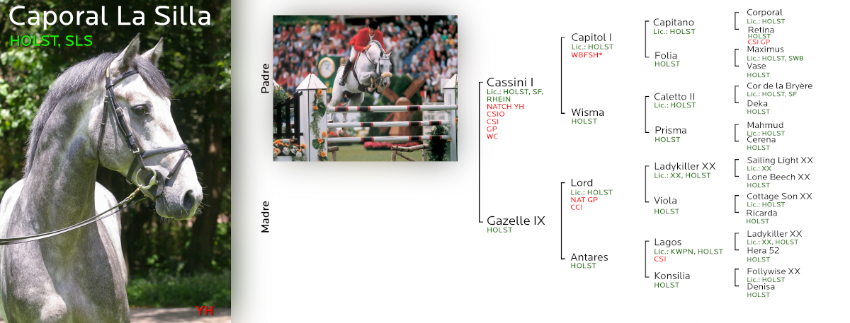 Su padre, Cassini I, HOLST, semental conocido mundialmente por su descendencia. Ganador de la Copa de Naciones en Helsinki y el Campeonato de Europa en Mannheim, en 1997. Entre sus éxitos se encuentran Londres, Leipzig y París.